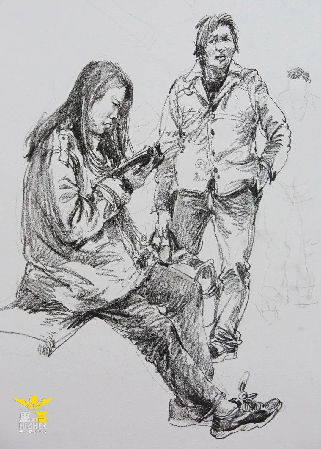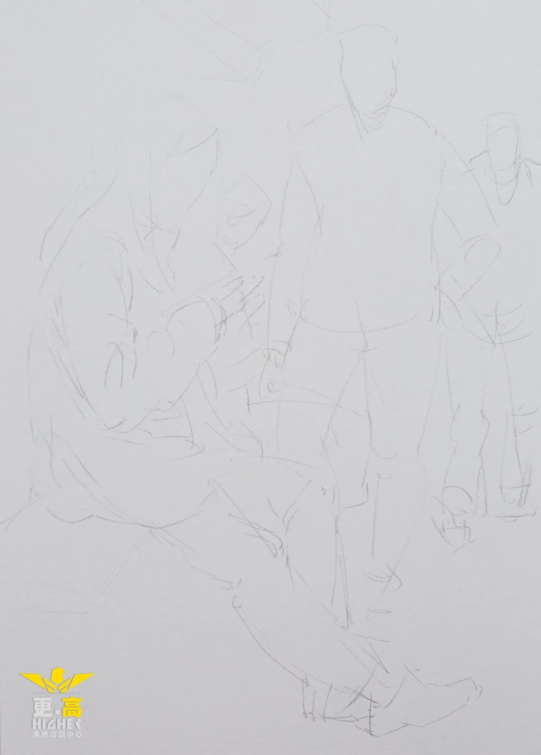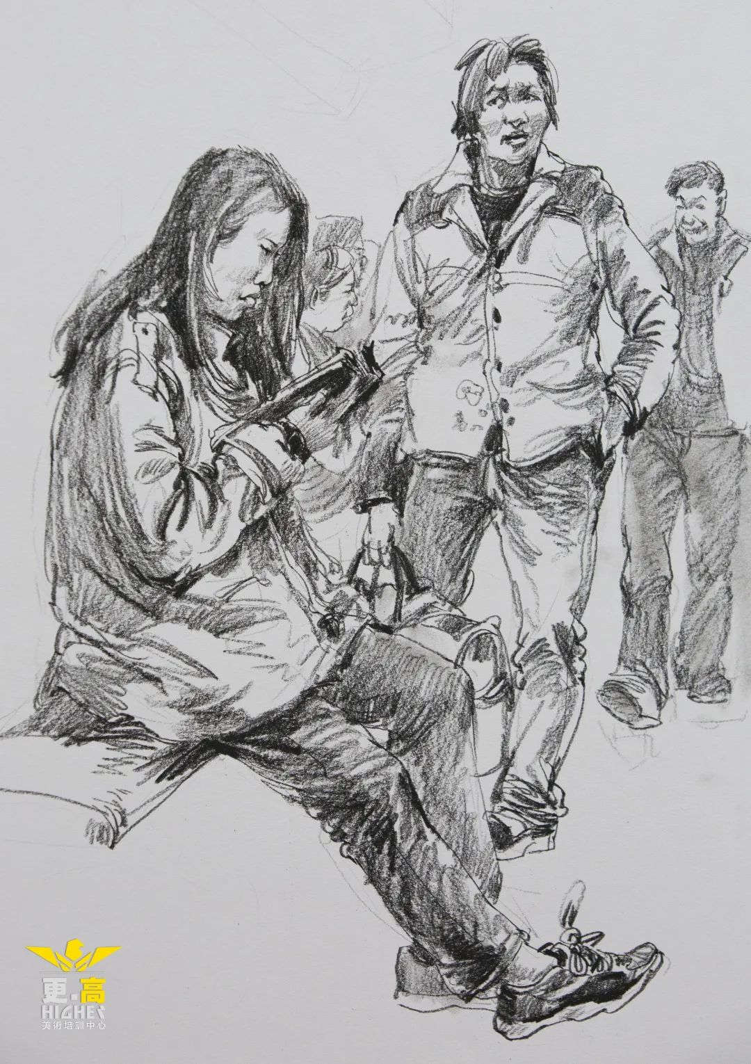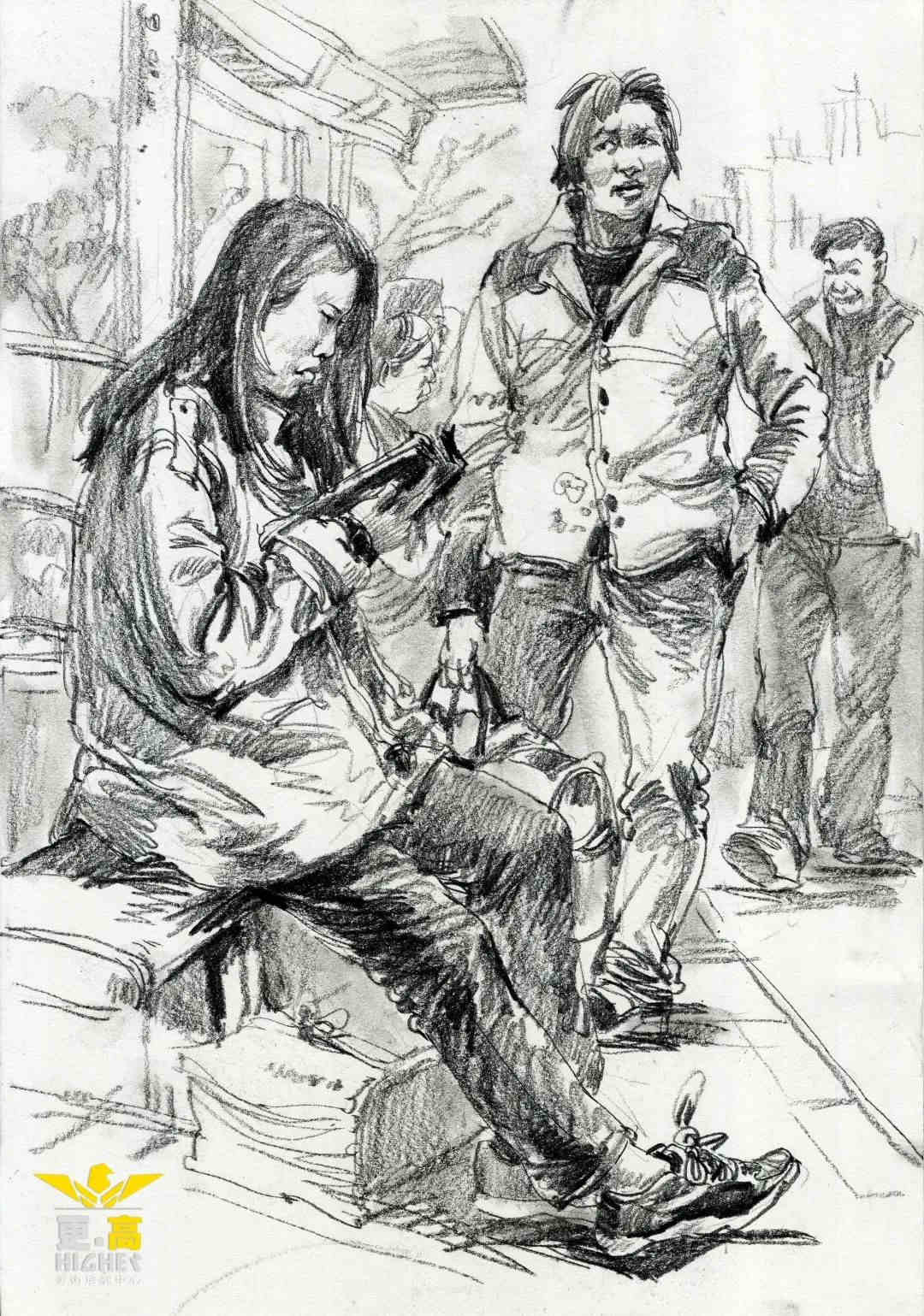 (1)構(gòu)圖,面對人物組合的場景,不宜馬上就動手畫,首先應該靜下心來,用幾分鐘的時間認真觀察人物組合之間的關系。要做到心中有數(shù),再著手起稿。要特別注意人物體之間的形體關系。
