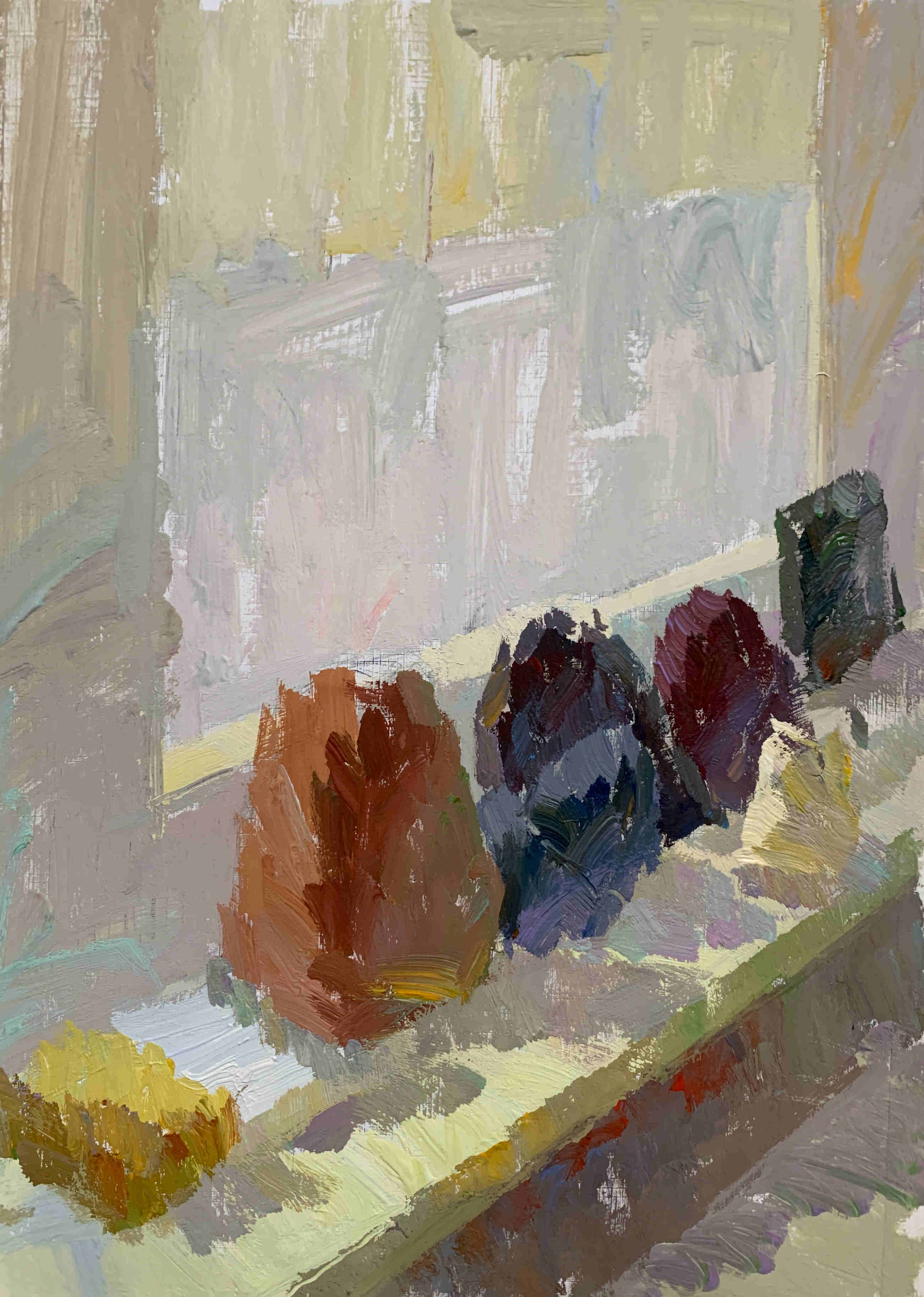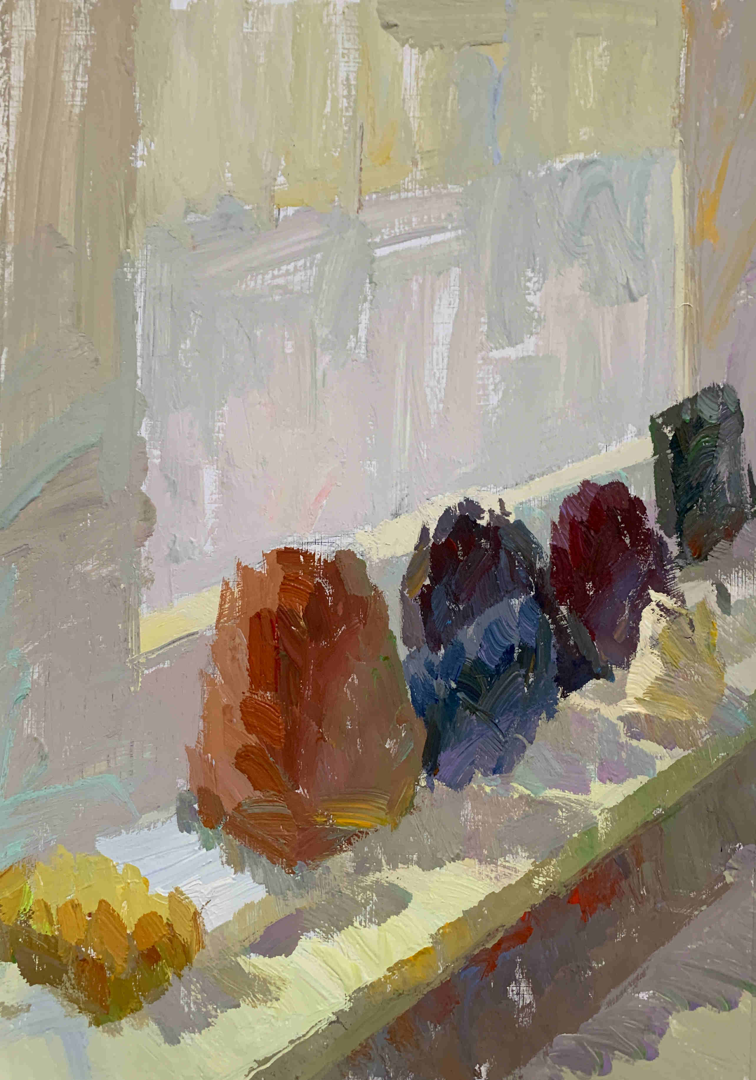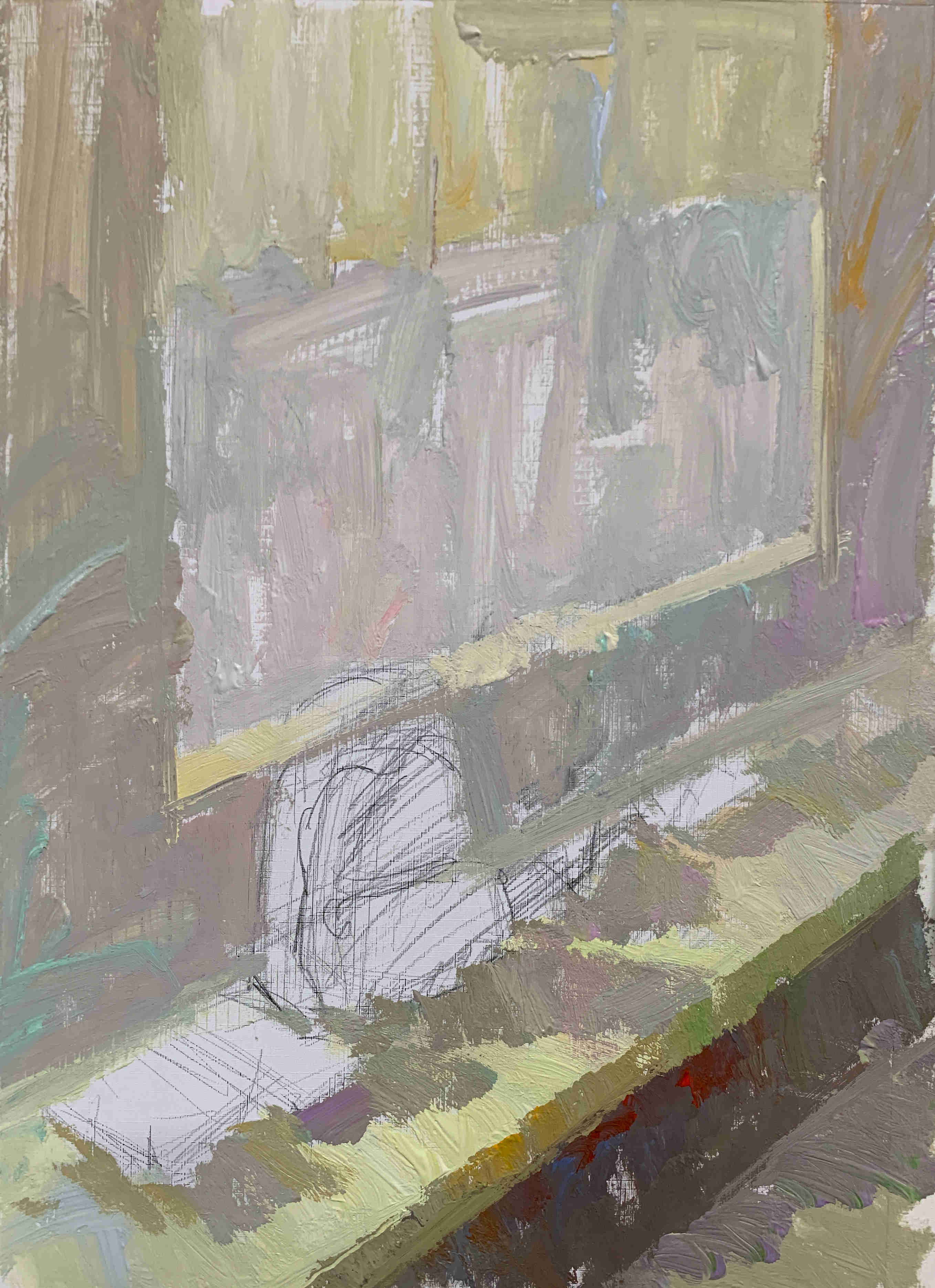 第一步:用鉛筆大致的將物體的位置畫出來,把大面積的顏色先鋪好,窗臺和臺面的亮暗面區(qū)分開,用大刷子把背景的顏色鋪好,畫背景的時候不要調地特別勻,讓它的顏色稍微豐富一些。
