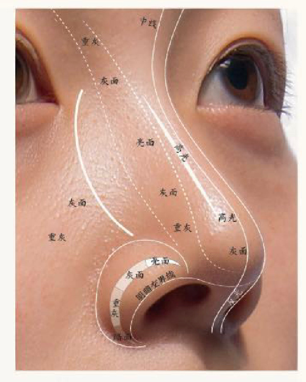 鼻部成三角隆起,分鼻底和基底兩部分,鼻根隆起的是鼻梁,鼻子是梯形棱柱,鼻頭是一個小球體,鼻底朝向要明確,鼻孔不能卡的太死。要畫清楚鼻子的透視和結構。