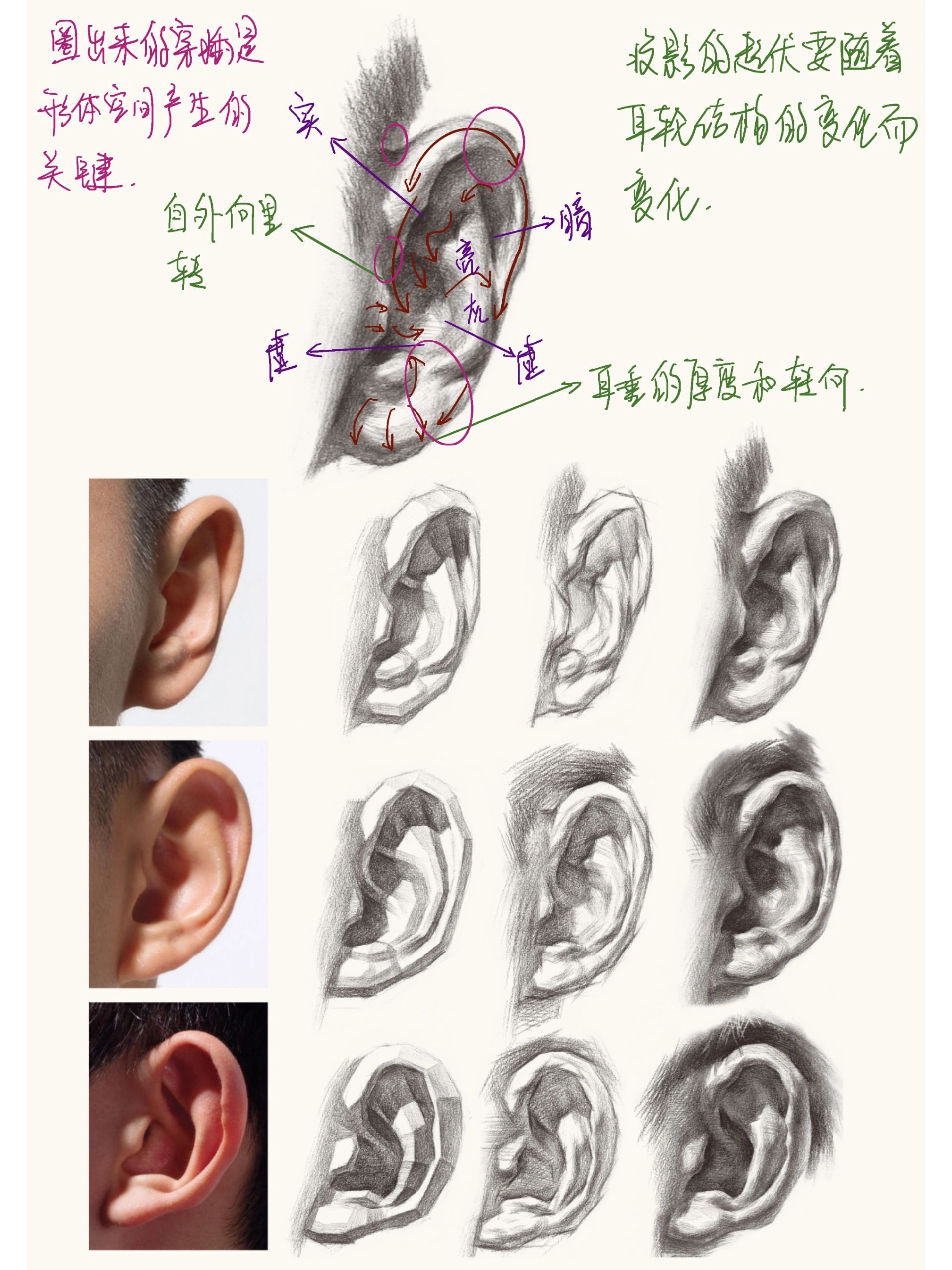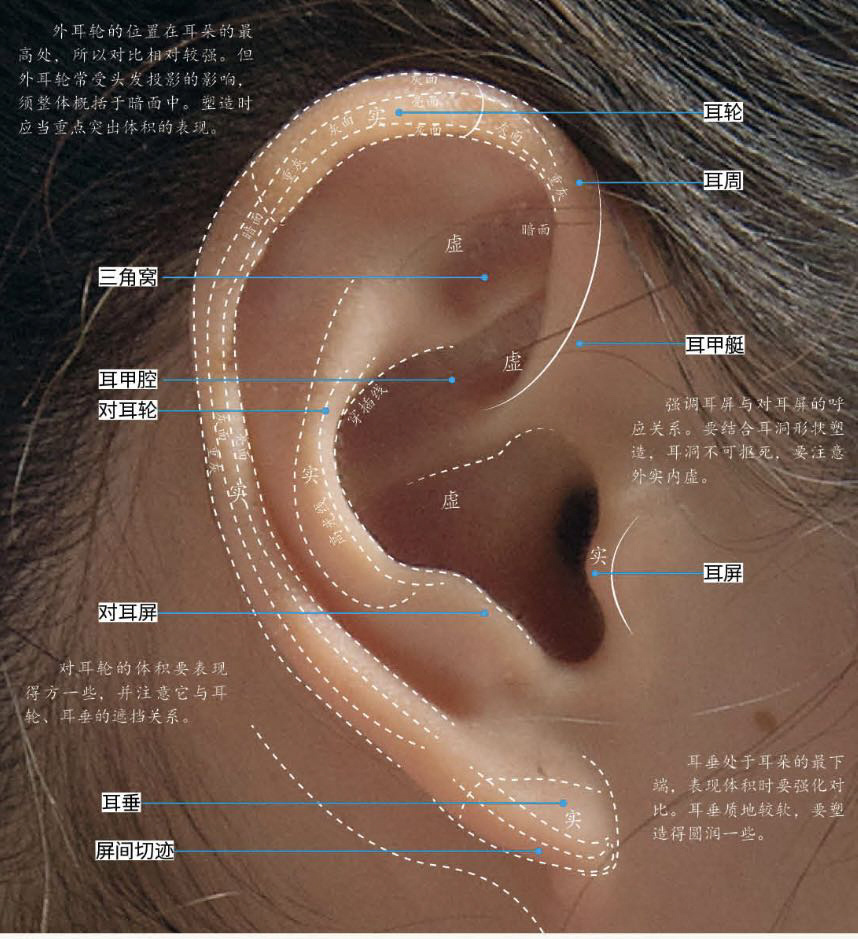 外耳輪是一條向耳朵孔向內旋轉的線,要畫出這個趨勢,外輪廓一定要畫出厚實感,要有方中帶圓,圓中帶方的感覺。把外耳輪,內耳輪和耳垂三個部分的結構畫好畫結實。