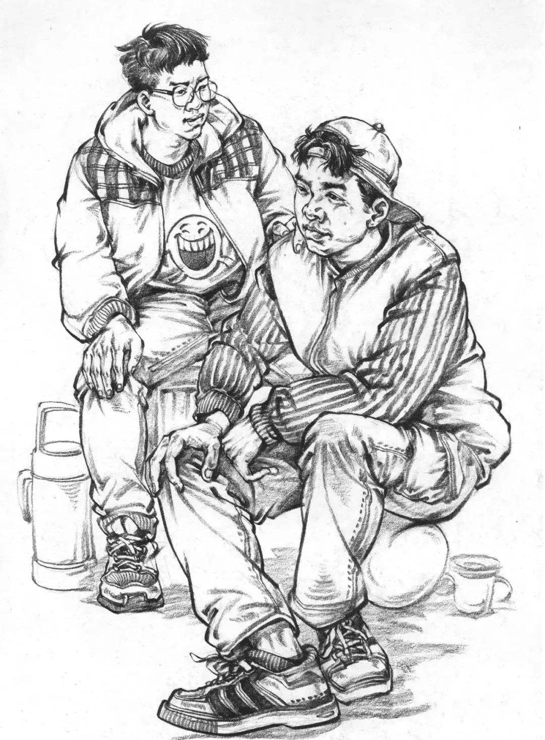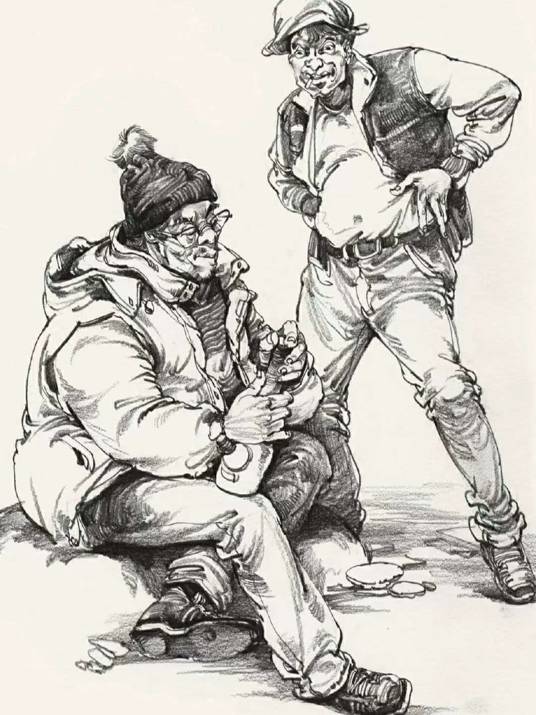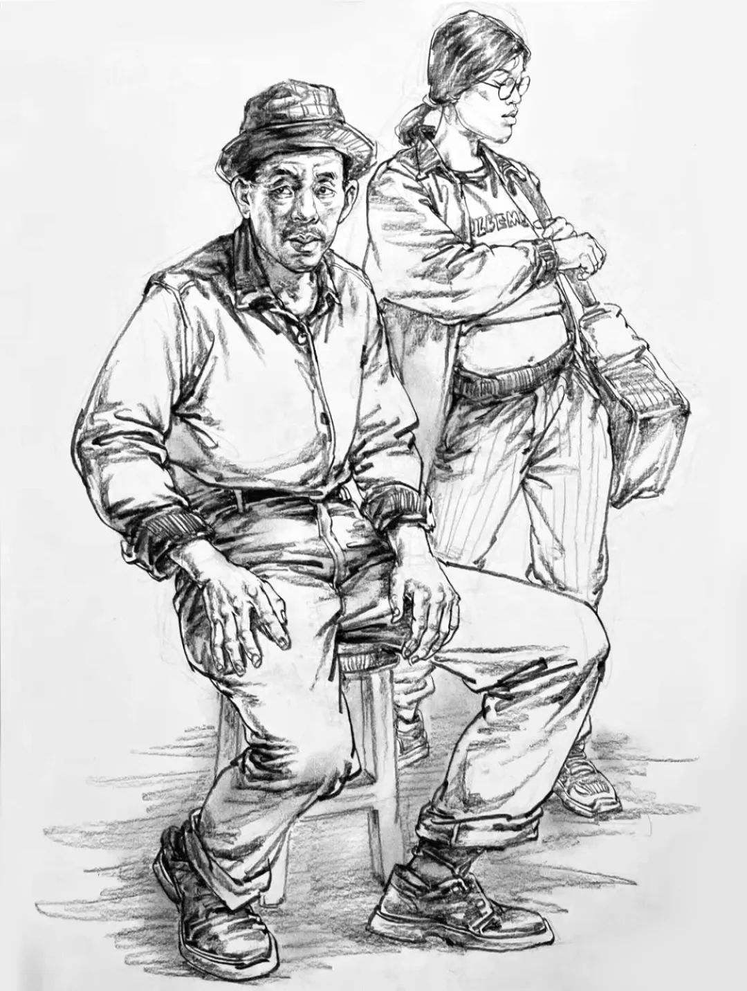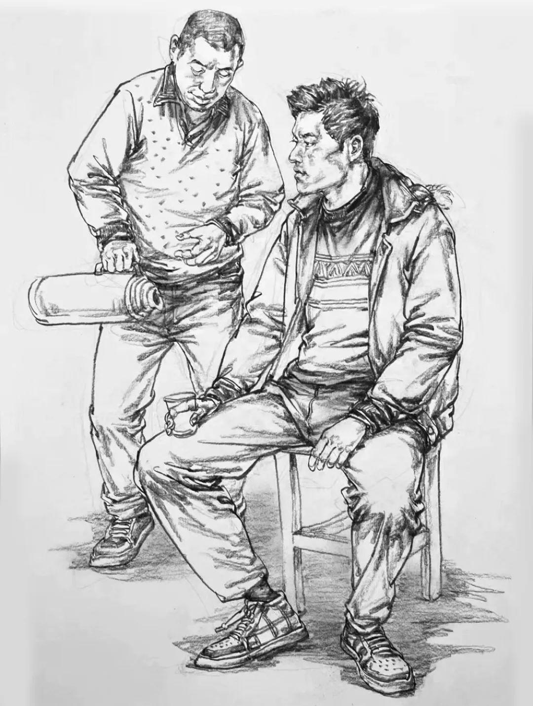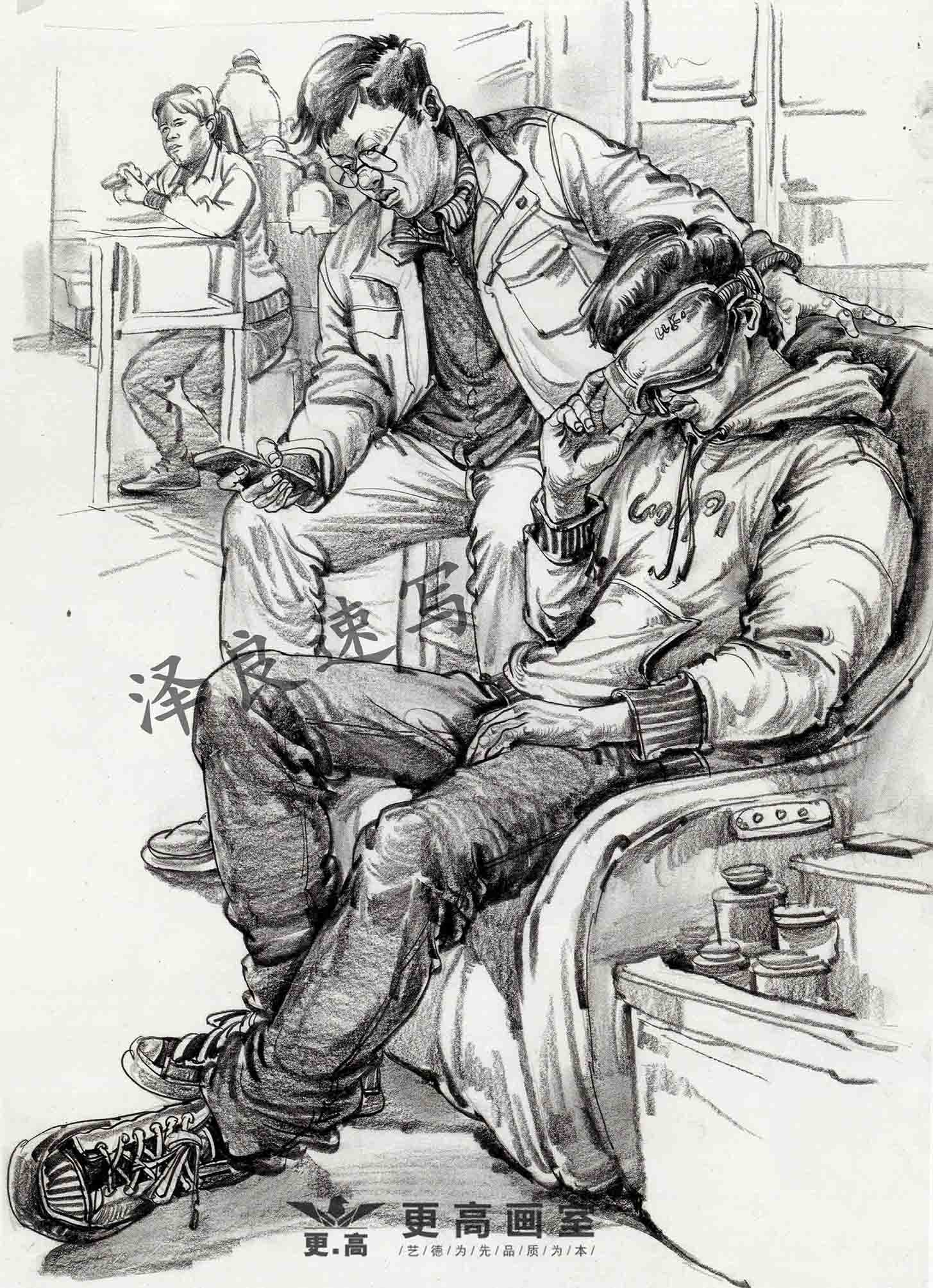 單人速寫(xiě)是研究人物本身的關(guān)系,組合速寫(xiě)是研究人與人之間的空間關(guān)系。