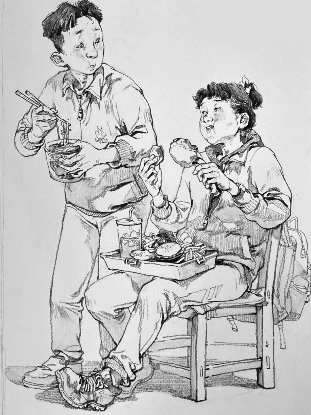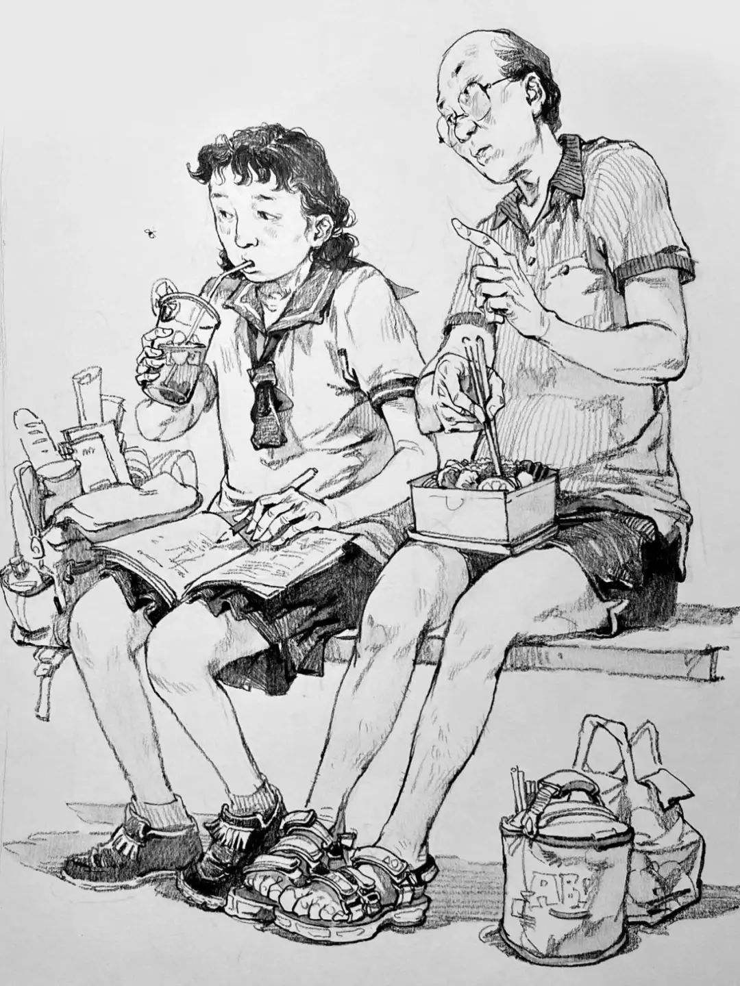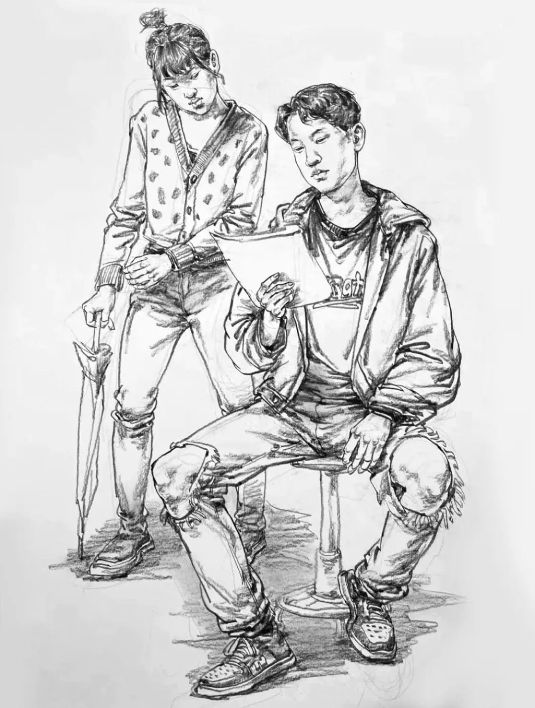 組合速寫(xiě)要有一定的故事性,這點(diǎn)和場(chǎng)景速寫(xiě)比較像,即使沒(méi)有很豐富的場(chǎng)景,雙人速寫(xiě)有了故事性也會(huì)更有可看性,老師能從你的畫(huà)面中看出來(lái)生活的味道,這是高分至關(guān)重要的地方,要學(xué)會(huì)利用一些小的道具來(lái)營(yíng)造畫(huà)面氛圍,同時(shí)要注意前后的空間關(guān)系,近實(shí)遠(yuǎn)虛。