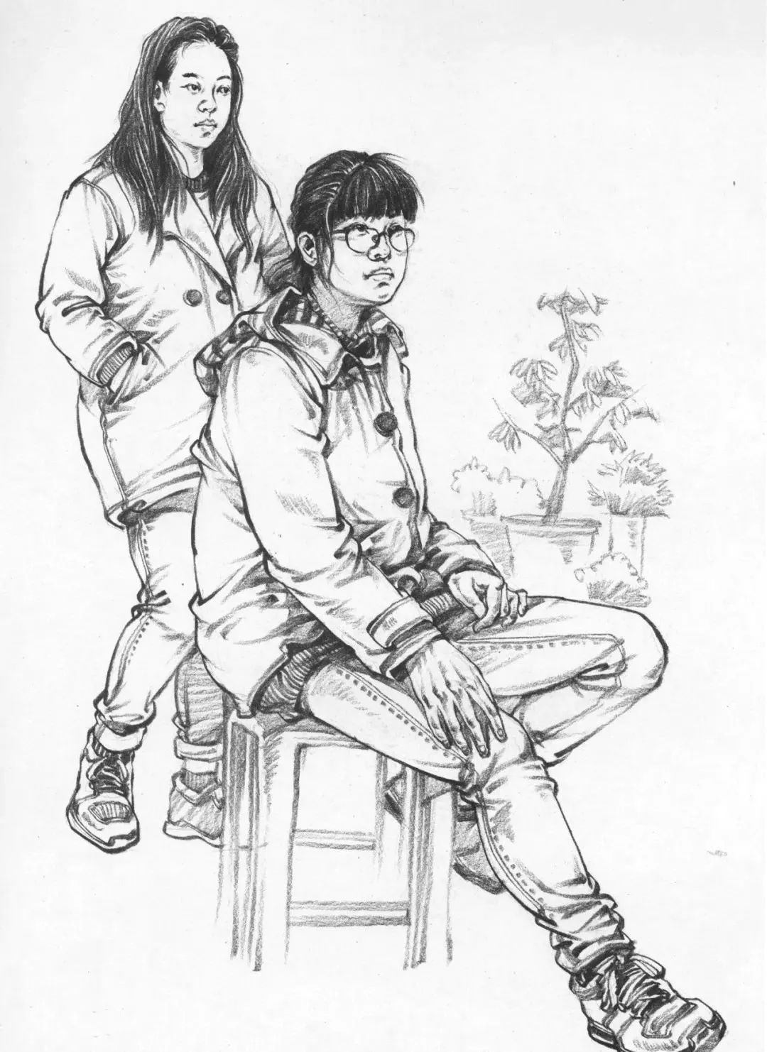 最后是雙人速寫(xiě)一定要注意比例,因?yàn)橐话闶钦咀?坐姿的組合,兩個(gè)人本身來(lái)說(shuō)身高、體重、比例就會(huì)不一樣,那么我們?cè)诎阉麄兘M合起來(lái)的時(shí)候更要注意這些問(wèn)題,不能看上去不在一個(gè)空間里,或者是比例很奇怪,所以空間透視一定要畫(huà)對(duì),不然這樣的速寫(xiě)也是不耐看的。