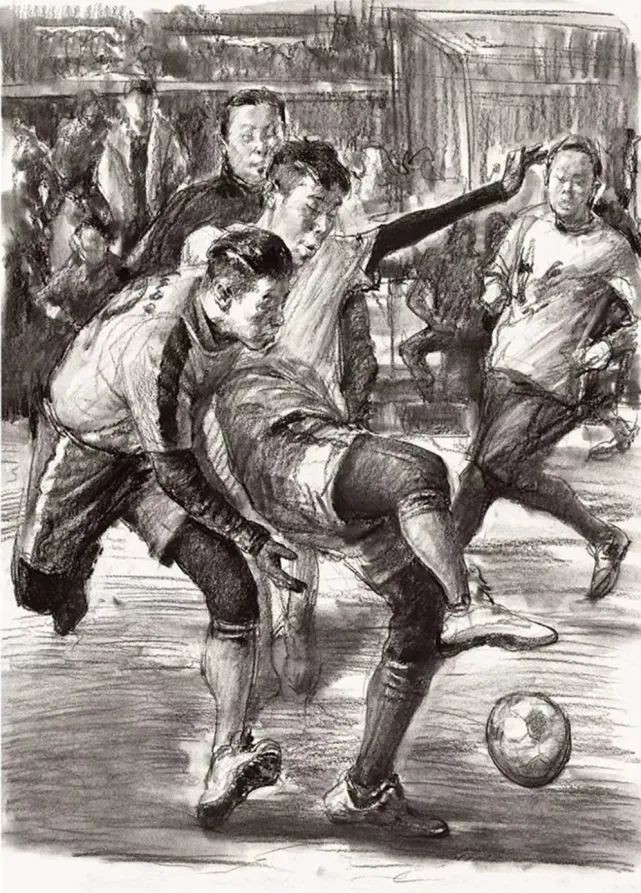 下圖這張速寫(xiě)是難度比較高的,我們只看畫(huà)面中考前的四個(gè)人物,最前面的兩個(gè)人在搶球,很明顯他們是最主要的,不管是在五官、頭手腳、服飾、動(dòng)態(tài)的塑造上都是非常完整的,而后面兩個(gè)人起到了襯托的作用,左后方這個(gè)人的身體被擋住了,所以把衣服加重,往后虛掉,右后方的人物有一定的動(dòng)態(tài),衣服畫(huà)白一點(diǎn),與背景有一定的區(qū)分,同時(shí)填補(bǔ)了這個(gè)區(qū)域的空缺,四個(gè)人構(gòu)成了一個(gè)非常舒服的畫(huà)面,這個(gè)時(shí)候再加一些背景、投影就很好處理了!
