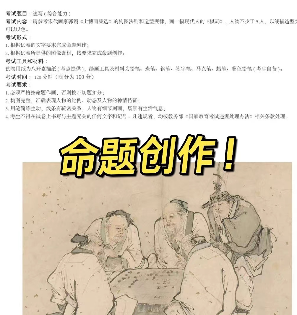 名畫置換都是會提供構(gòu)圖,人物動態(tài)都會參考,你只需要根據(jù)畫面去做改動,增加你的創(chuàng)意就好了,相對于往年的純默寫來說,其實(shí)會更簡單一些,命題創(chuàng)作的考題分純文字闡述,照片+文字闡述,照片+文字闡述,你需要參考考題給到的素材圖,去基本還原素材圖的構(gòu)圖,人物,動態(tài),你要記住人物是重心,你要把人物的性別,體態(tài),年齡,職業(yè),這四個特征表達(dá)清楚,這樣才能貫穿主題,背景可以弱化,不要喧賓奪主。