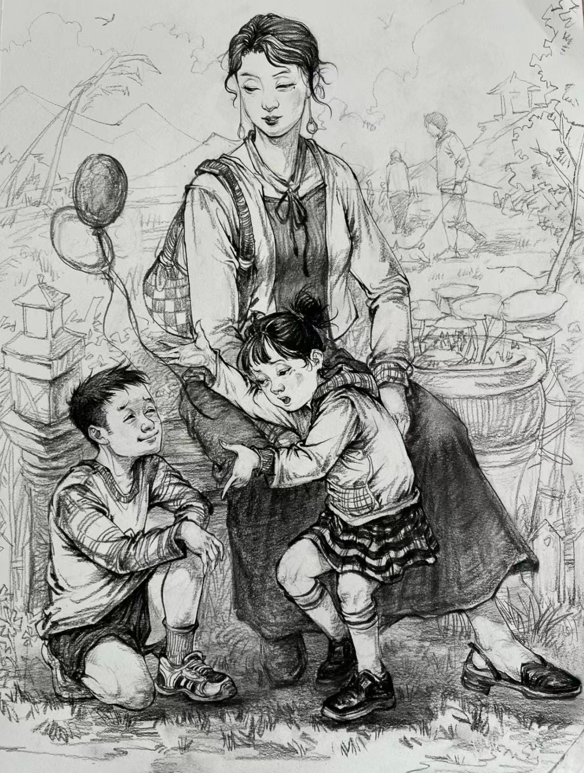 如果是三個人,那么你需要重點(diǎn)刻畫這三個人的細(xì)節(jié),分析他的人物動態(tài),神態(tài),比如他的眼睛在看向哪里或者看向誰,你要看看它的前后景關(guān)系,是環(huán)境在前呢,還是人物在前呢,參考完構(gòu)圖,環(huán)境,之后再就是去置換,人物的身份,服裝,道具,以及環(huán)境,畫一幅新的主題作品,你可以把大人置換成小孩,褲子置換成裙子,玩具車置換成寵物,這些置換后的東西組合在一起,最終會串聯(lián)成一幅完整的故事畫面。