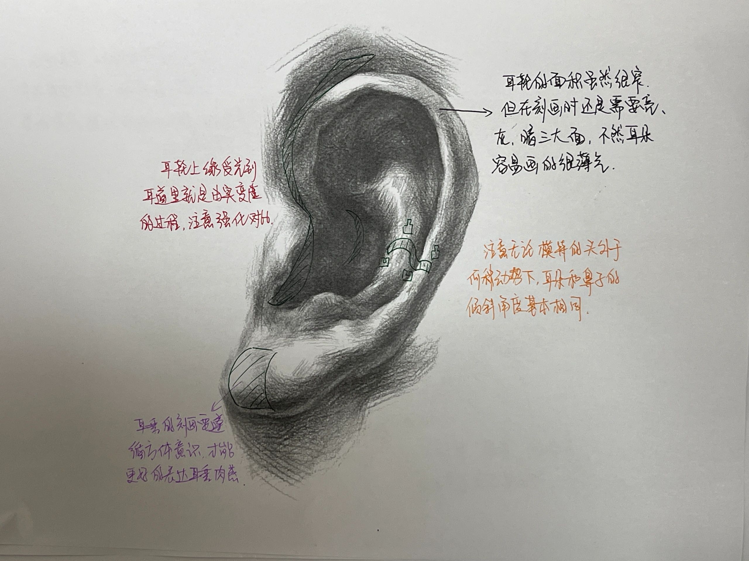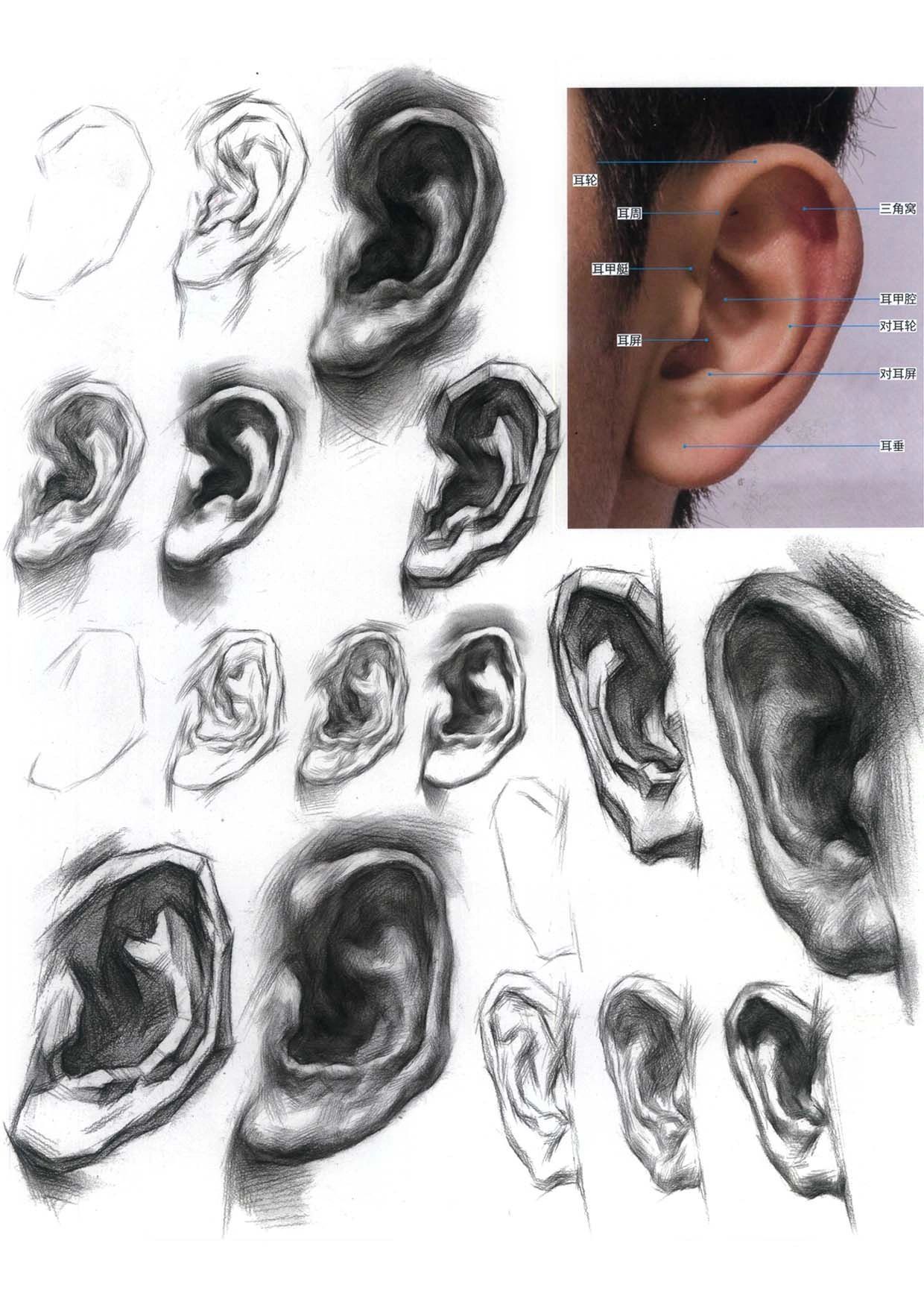 耳朵呈半圓形,包含耳輪、耳孔、耳垂等結(jié)構(gòu),耳朵的刻畫程度因視角而定。畫頭像時千萬不能忽視耳朵的刻畫。耳朵因為位置特殊,常被頭發(fā)擋住,但因此也不能忽略,在刻畫時要把握好透視關(guān)系,再根據(jù)模特耳朵特征進行造型。