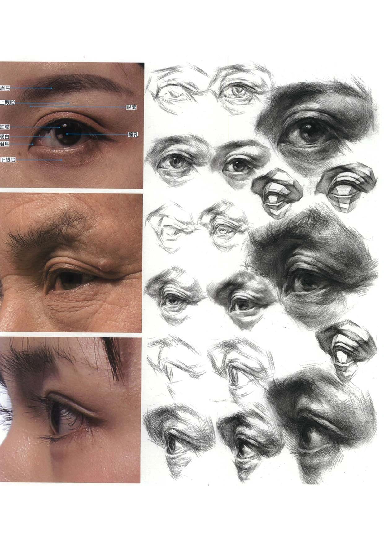 眼珠隨角度透視變化成不同的橢圓,正面最完整,全側(cè)面最扁只能看到半個面不一定能看到高光,側(cè)面和全側(cè)面一定要注意眼部有明顯的凹凸要畫出上眼皮包裹下眼皮的感覺。