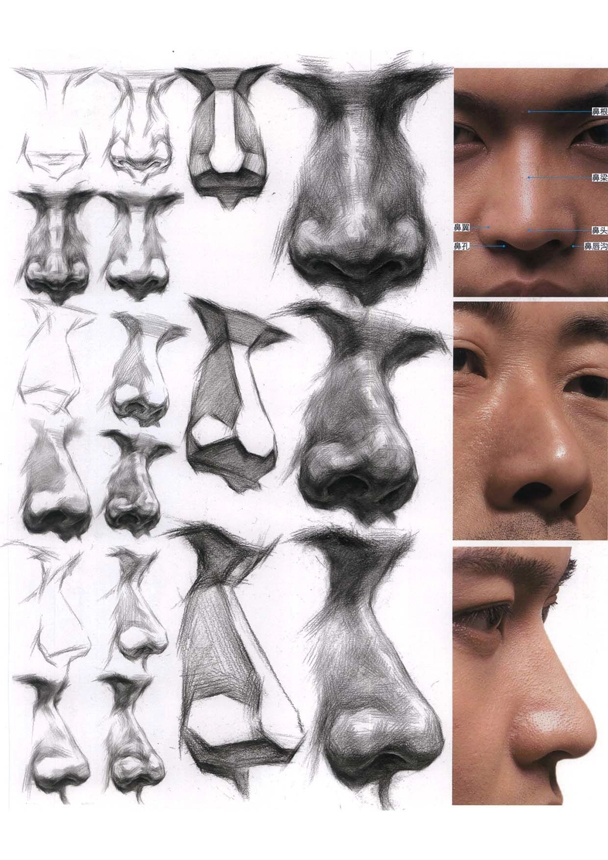 鼻子是五官最突出的器官,它由鼻根、鼻梁、鼻翼、鼻頭、鼻孔、鼻唇溝組成。畫鼻梁時注意中間和兩側(cè)三個面的形狀和變化。鼻底是難點之一,注意形狀,明暗交界線和反光,鼻子上的轉(zhuǎn)折很多,要多理解五官上的轉(zhuǎn)折變化。