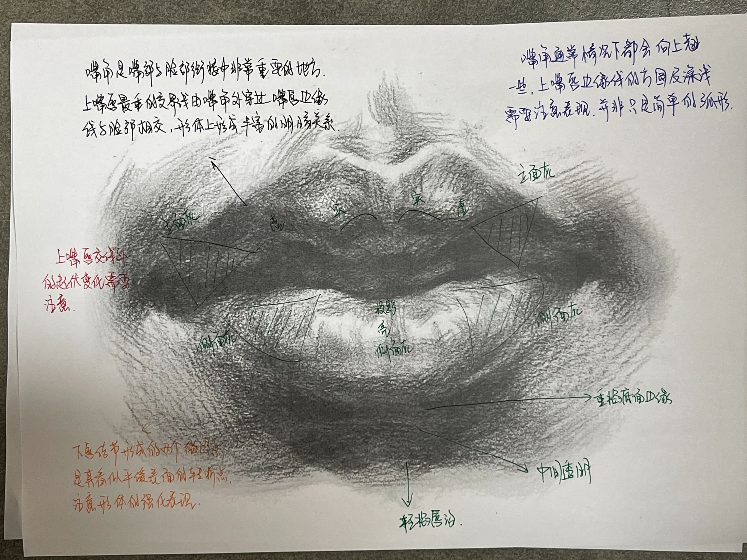 嘴唇中間實、對比強、兩邊虛、對比弱,嘴巴色彩不宜過重,亮點要突出增加體積感,嘴角可是刻畫重點。
