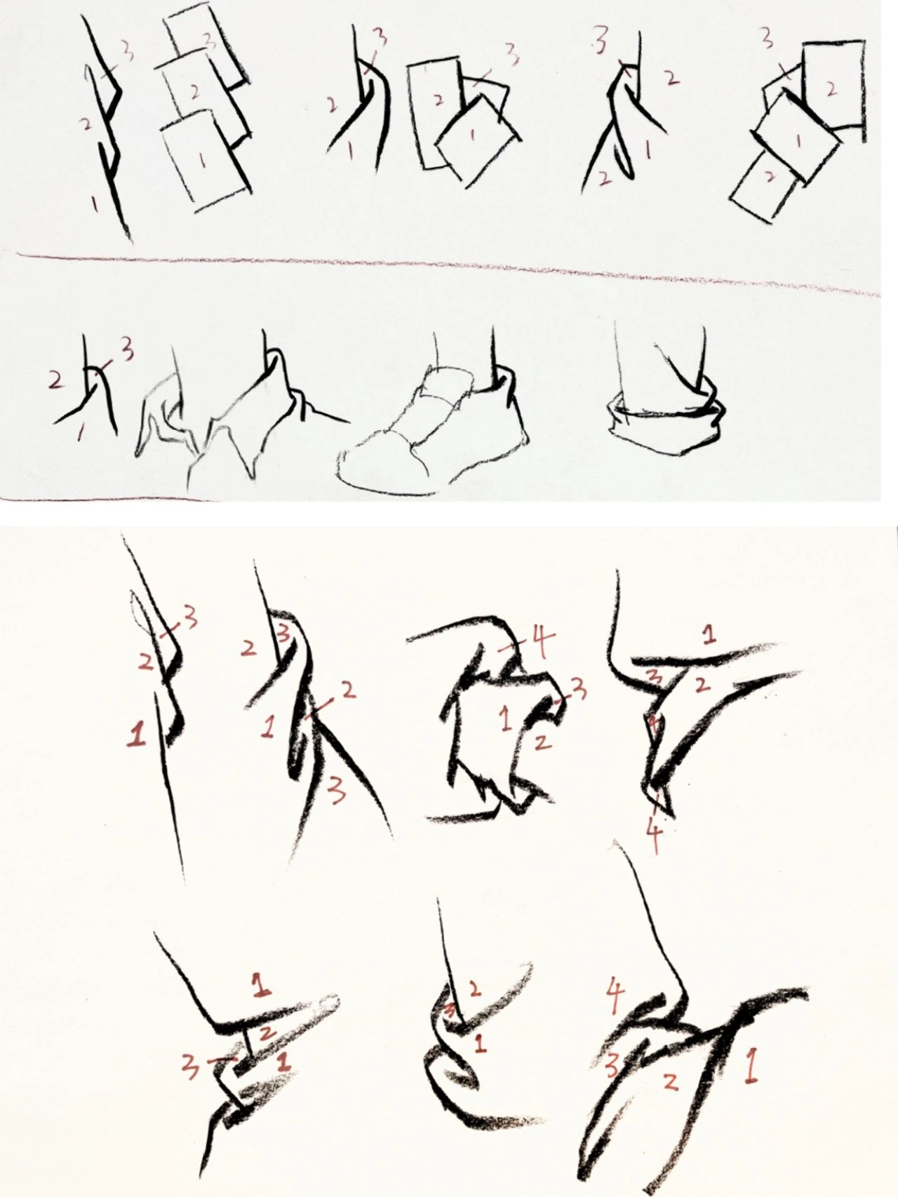 2.懸垂褶皺就是在畫素描的時候找兩個支點作為衣物的懸掛點,常見的褶皺膝蓋之間,肩膀之間,肩膀和伸出的手臂之間。
