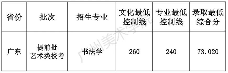 3.“提前批統考+校考”書法學專業錄取最低綜合分72.223分; 綜合分=文化總分÷