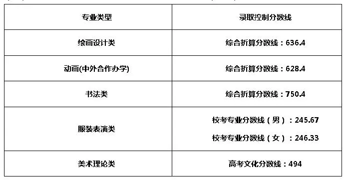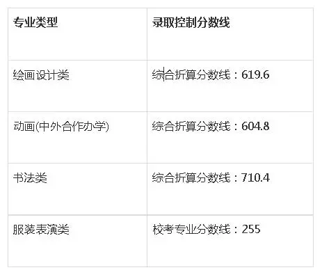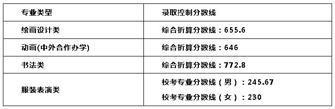 1.繪畫設計類、動畫(中外合作辦學)綜合折算方式:(高考文化成績×0.4+校考專業成績×0.6)×2。