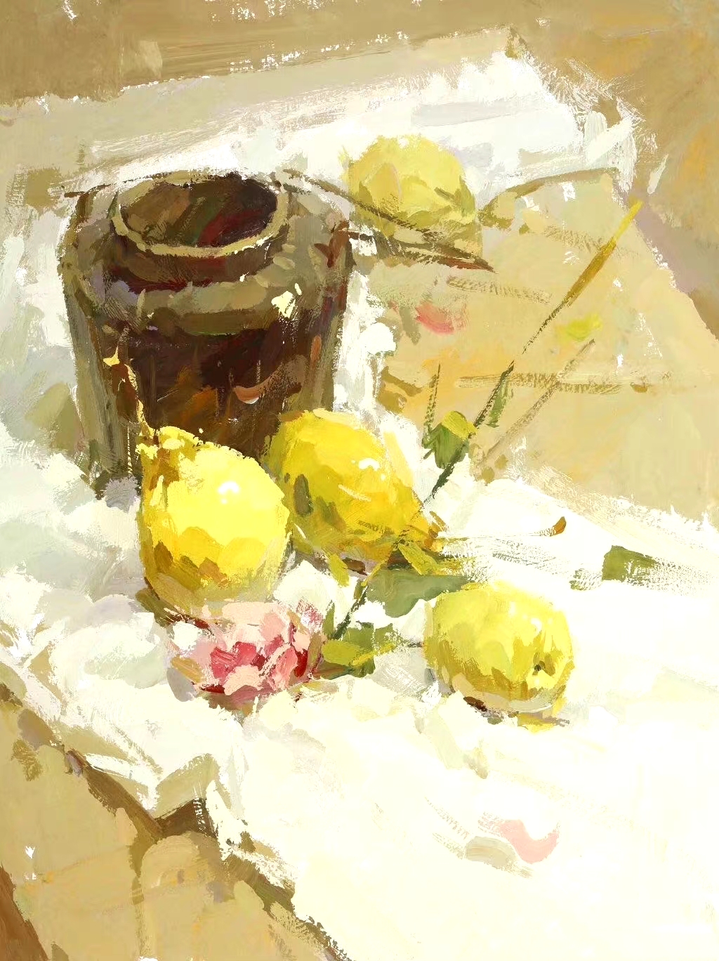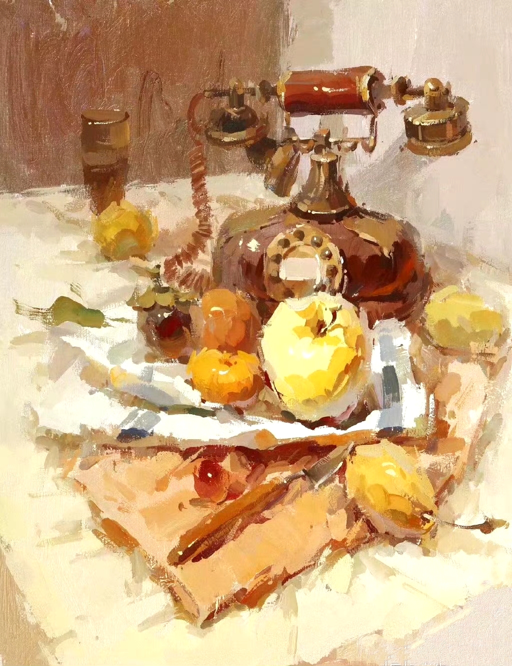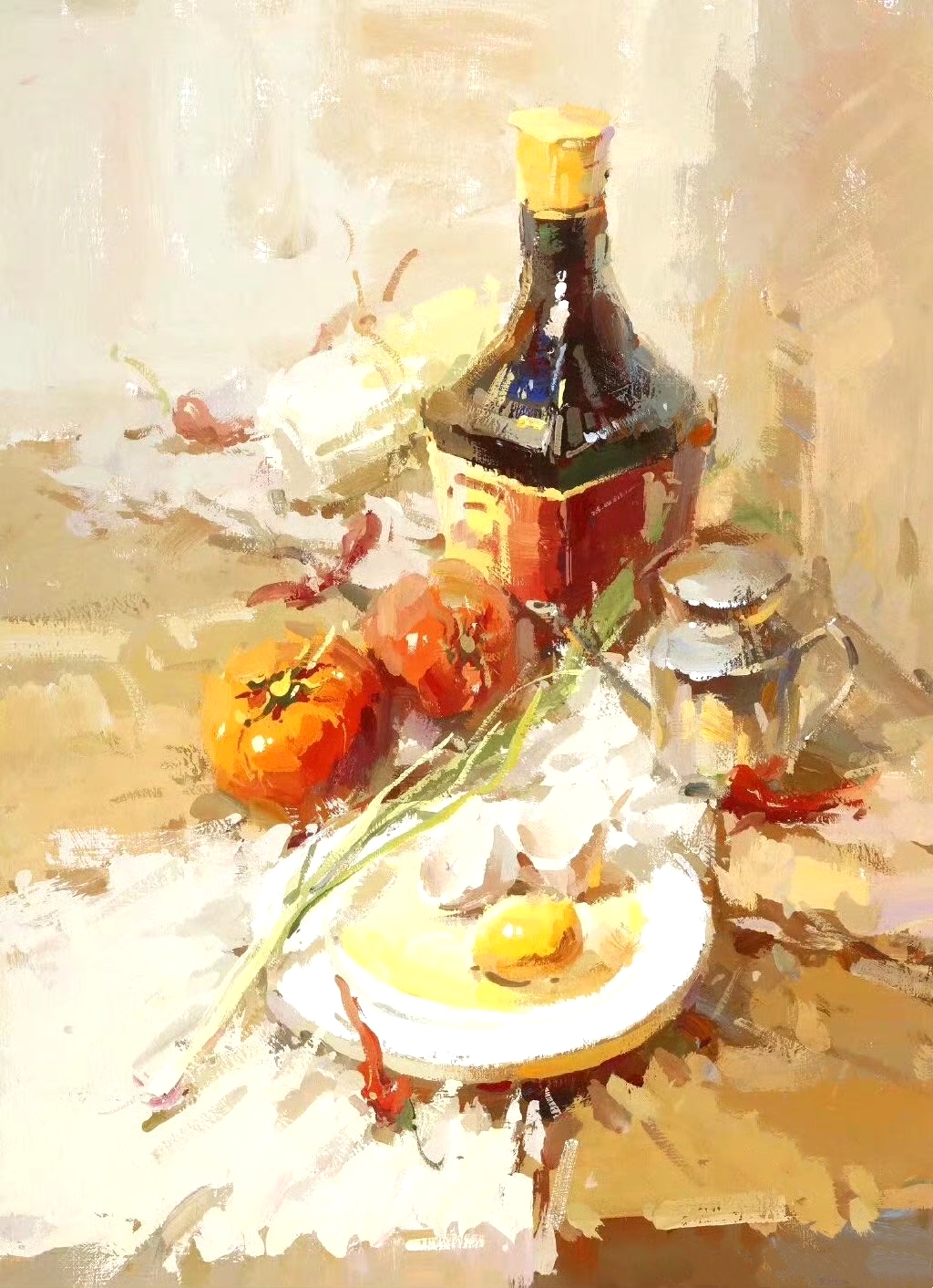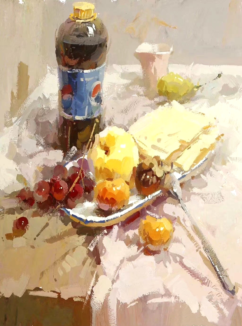 物體造型要結(jié)實(shí),外輪廓要虛實(shí)結(jié)合,掃出去的顏色力量要小一些,不要太大面積。鋪色時(shí)畫(huà)好固有色和環(huán)境色,豐富反光的環(huán)境色要添加少許冷色掃上去。重的地方要卡一卡,要自然一些,不要太跳了。